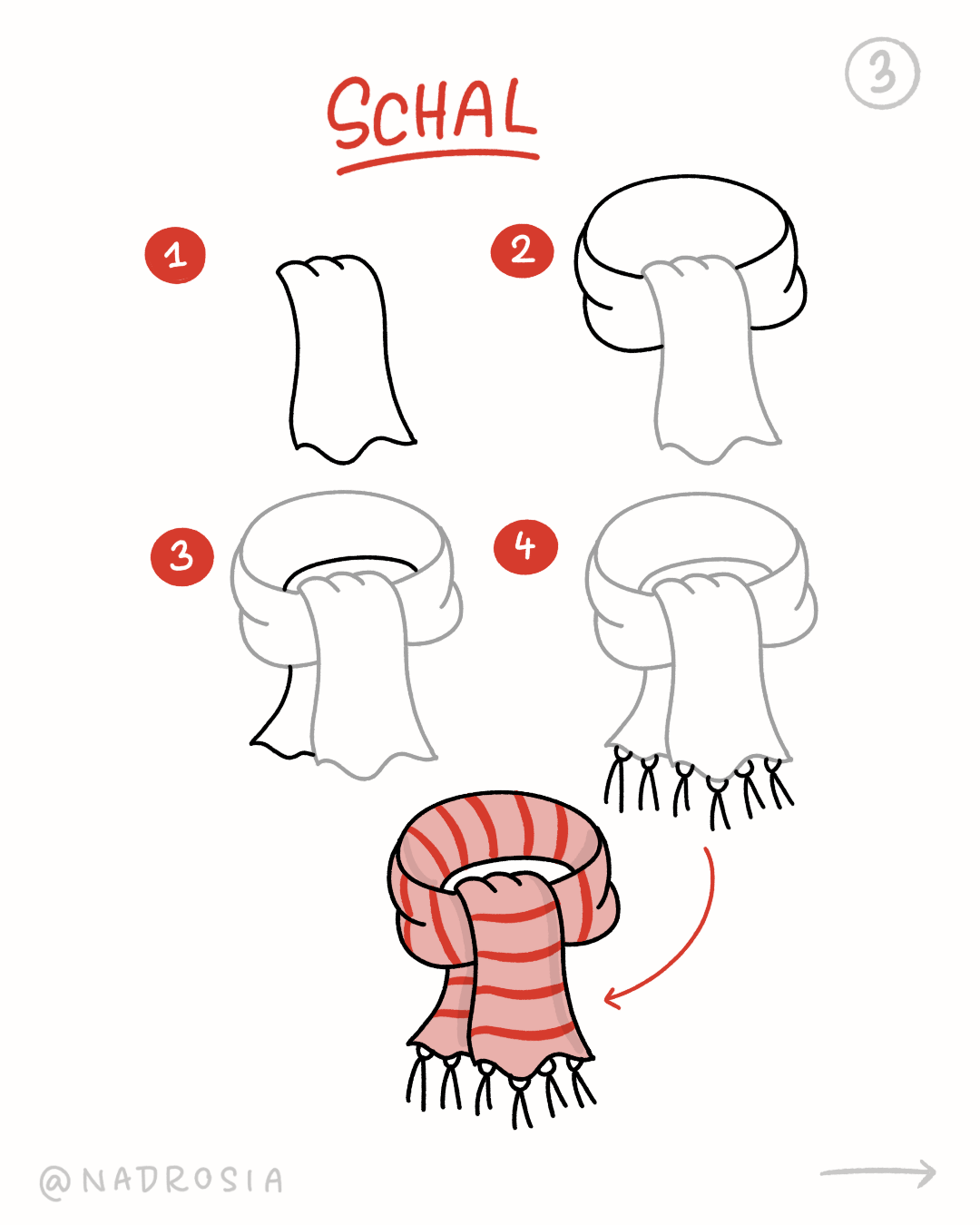 Symbole-November-zeichnen-Schal von Nadine 9. November 2025 Kommentare0Zeichenanleitung für einen gestreiften Schal in vier Schritten – vom einfachen Stoffstück bis zum farbigen, eingerollten Schal mit Fransen. 0 Kommentare zu “Symbole-November-zeichnen-Schal”Schreibe einen Kommentar Antworten abbrechenDeine E-Mail-Adresse wird nicht veröffentlicht. Erforderliche Felder sind mit * markiertKommentar *Name * E-Mail * Website Beitrags-NavigationVorheriger Beitrag 5 schnelle Symbole, die du im November überall verwenden kannst (mit Anleitung)Vorheriger Beitrag